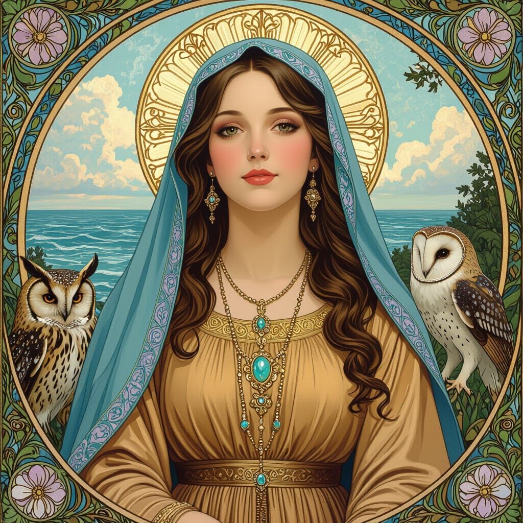This image shows Mother Mary with Titian hair in a sky-blue headdress, adorned with jewelry, and surrounded by forest creatures. She is set against an oceanic view in art nouveau style.