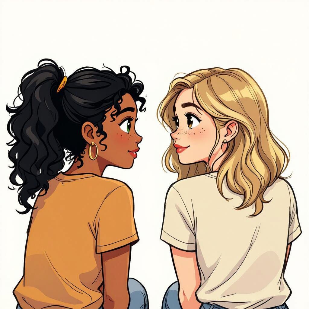 This image shows two teenage girls sitting together, rendered in a cheerful, expressive comic book style with soft lines and warm colors, inspired by naturalistic character art.