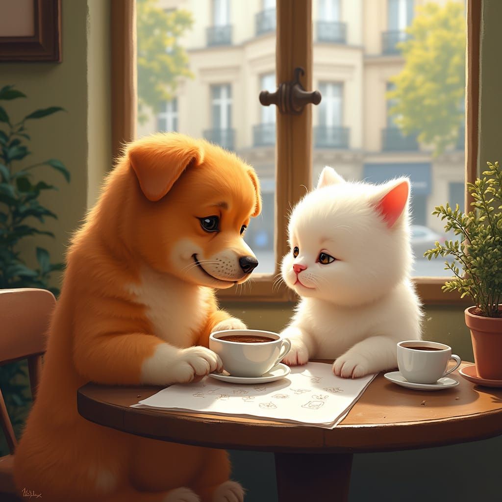 This heartwarming digital painting captures a charming moment of friendship between a chubby orange dog and a fluffy white cat as they enjoy coffee and brainstorm together at a Parisian cafรฉ, surrounded by soft natural light and intricate details.