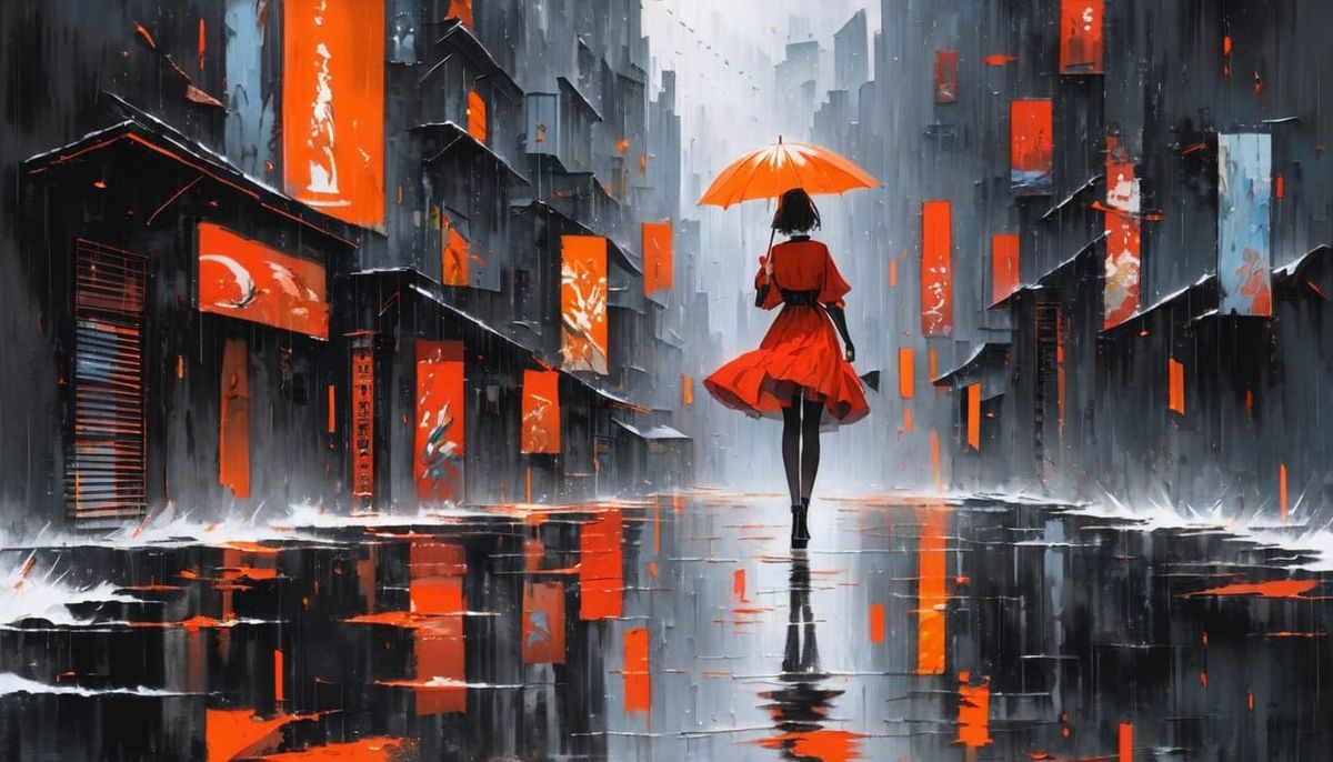 A striking picture of a woman in a red dress walking in the rain with an orange umbrella. This abstract impressionist gouache painting features heavy impasto brush strokes and a dark, moody color palette.