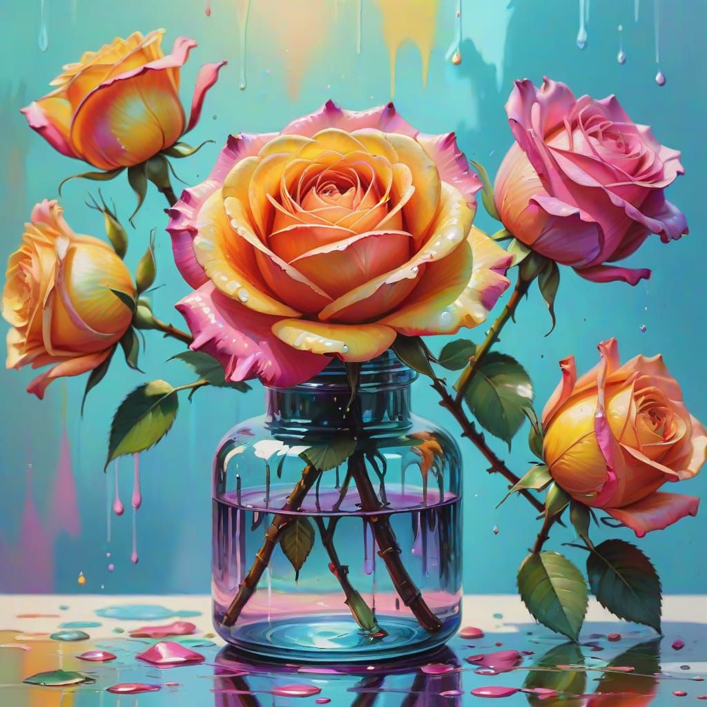 This stunning image showcases a close-up of colorful roses blooming in a delicate glass bottle with a cork, set against a soft pastel background. The artwork features vibrant, photorealistic colors and intricate details, blending traditional Chinese painting techniques with modern street art flair.