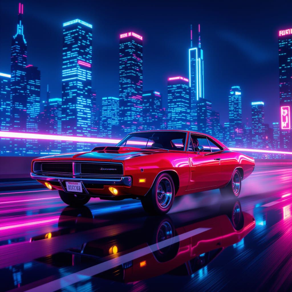 A gleaming red 1969 Dodge Charger races through a futuristic city, illuminated by vibrant magenta and cyan neon lights. Cinematic realism captures reflections on wet asphalt and car surfaces with dynamic motion blur.