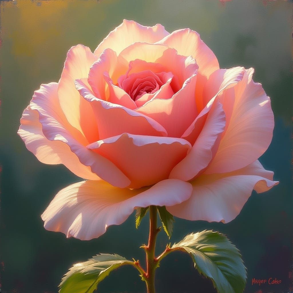 This image is a serene representation of a delicate rose flower, softly illuminated by warm sunlight, with gentle brushstrokes and vivid colors reminiscent of impressionist art.