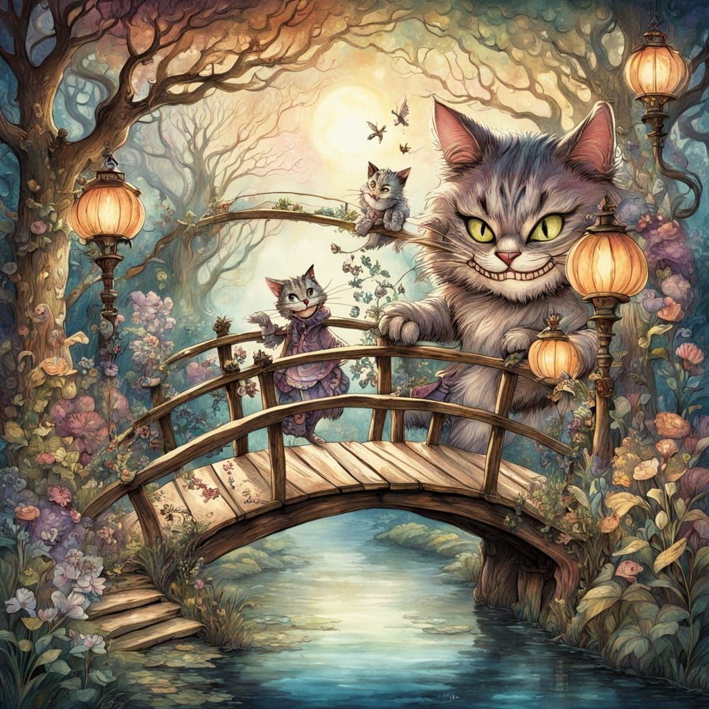 A vibrant illustration of Alice and the Cheshire Cat crossing a wooden bridge in a whimsical fantasy setting. The artwork evokes a fairytale atmosphere reminiscent of Arthur Rackham.