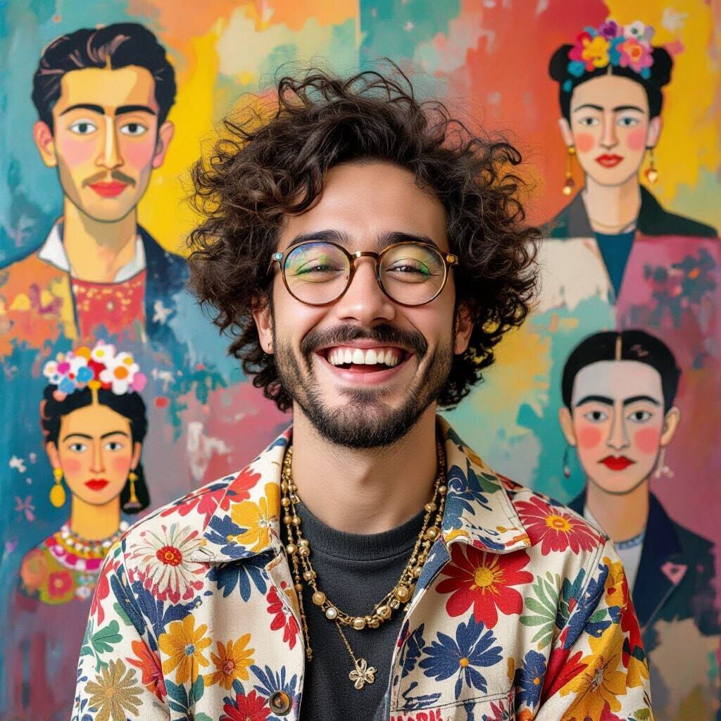A vibrant image of a person with autism and Down syndrome smiling amidst colorful surroundings. The artwork is rendered with surreal and expressionistic elements.
