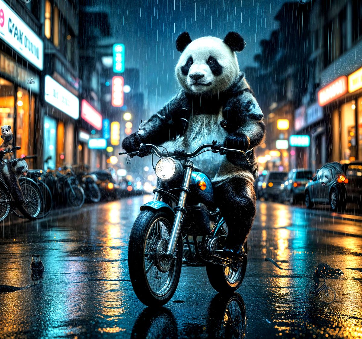Panda riding a bike at night in the city. Rain is falling and sparkling reflections in the light. Realistic and fantasy together cool colors...