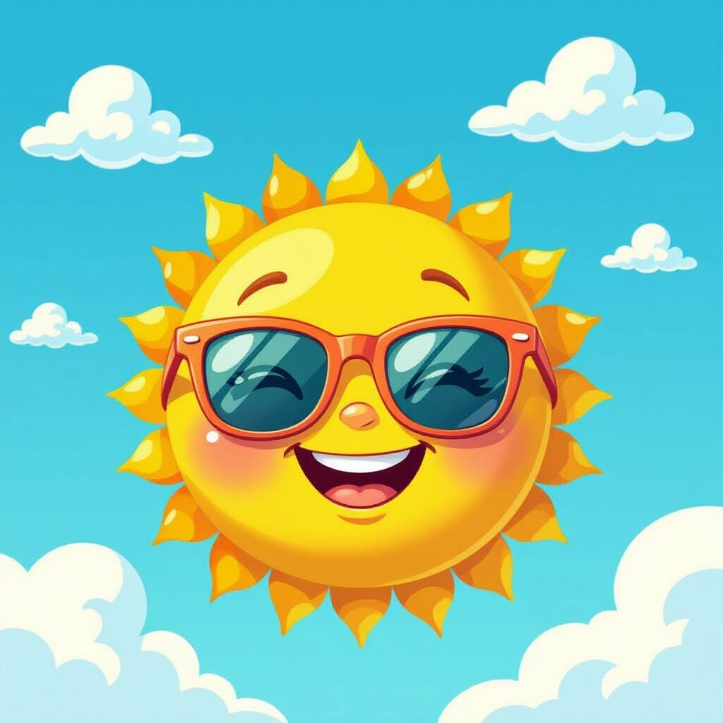 A cheerful cartoon sun wearing sunglasses smiles in a blue sky with fluffy clouds. This delightful image is rendered in a vibrant, kid-friendly coloring book style.