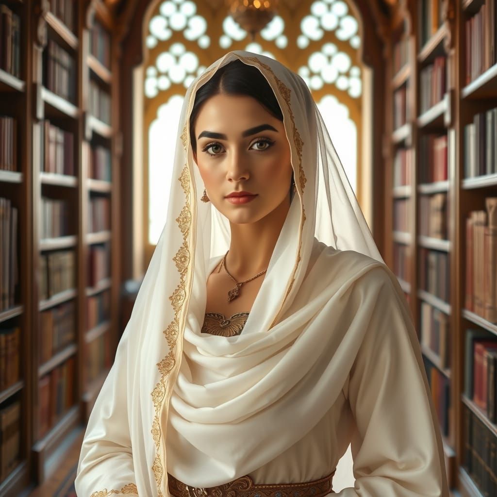 This image shows a young Arab noblewoman in a Renaissance-era library, adorned in elegant Arabic medieval attire and a veil, surrounded by ancient tomes and ornate architecture.