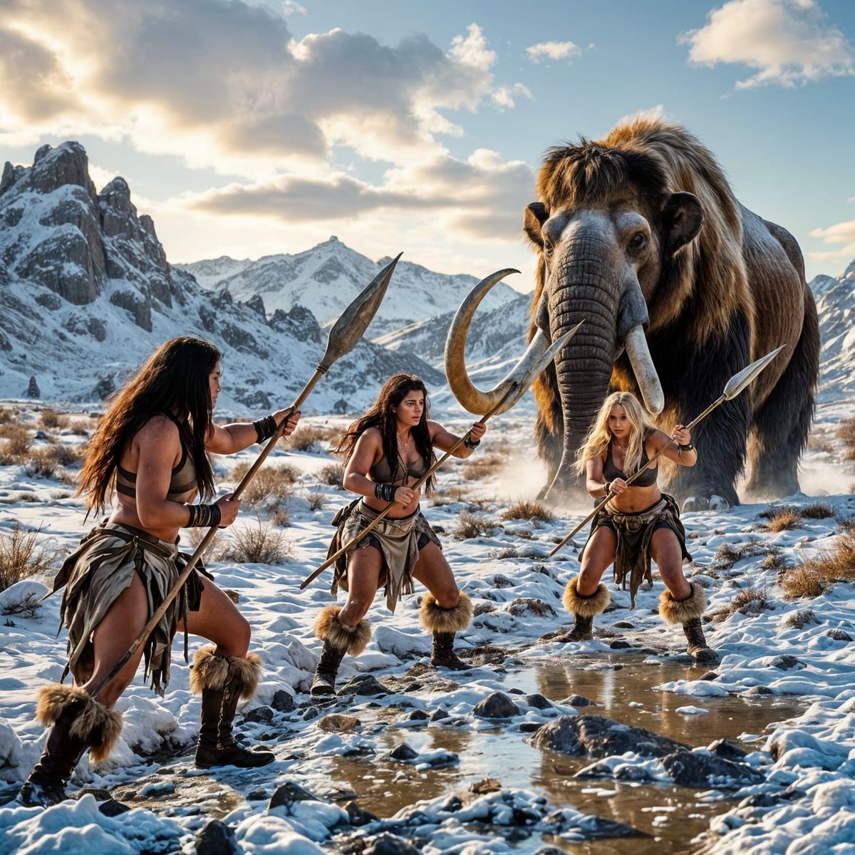 This ultra-high-resolution photograph captures three athletic Stone Age huntresses fiercely tracking a massive woolly mammoth across a frozen, arid landscape. Dramatic natural light highlights their raw realism.