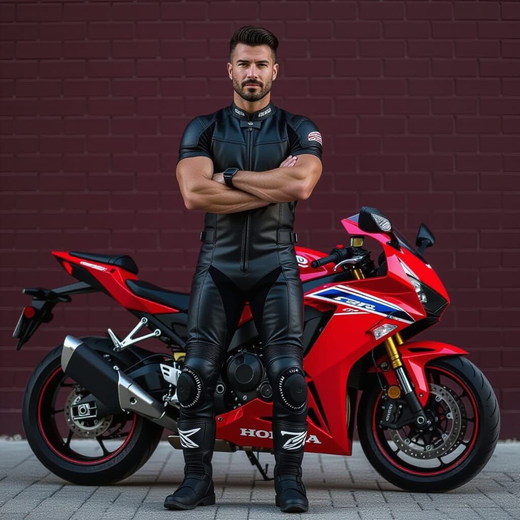 A striking picture of a slender, athletic Italian man with dark hair leaning on a red Honda CBR 600. He's wearing a form-fitting black and red catsuit and boots, with a brick wall backdrop.