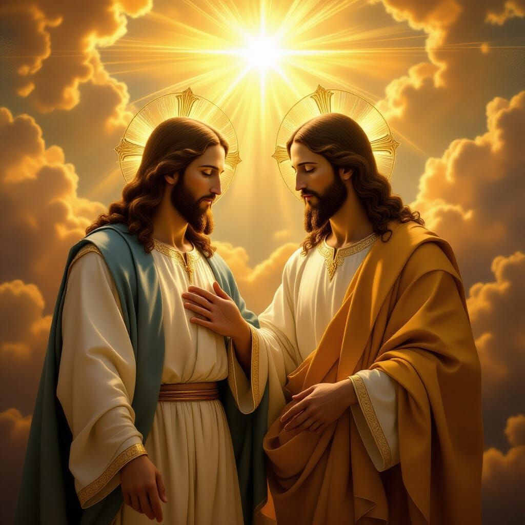 A divine and ethereal depiction of Jesus and God in a heavenly setting, bathed in golden light. The scene is rendered in a majestic style reminiscent of Renaissance masterpieces, focusing on luminous colors and profound peace.