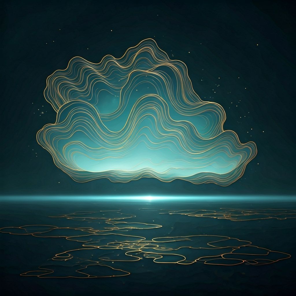 This image shows a minimalist Zen dreamscape with delicate gold outlines. The artwork is reminiscent of Chinese watercolor and alcohol ink techniques, enhanced by luminous twilight colors.