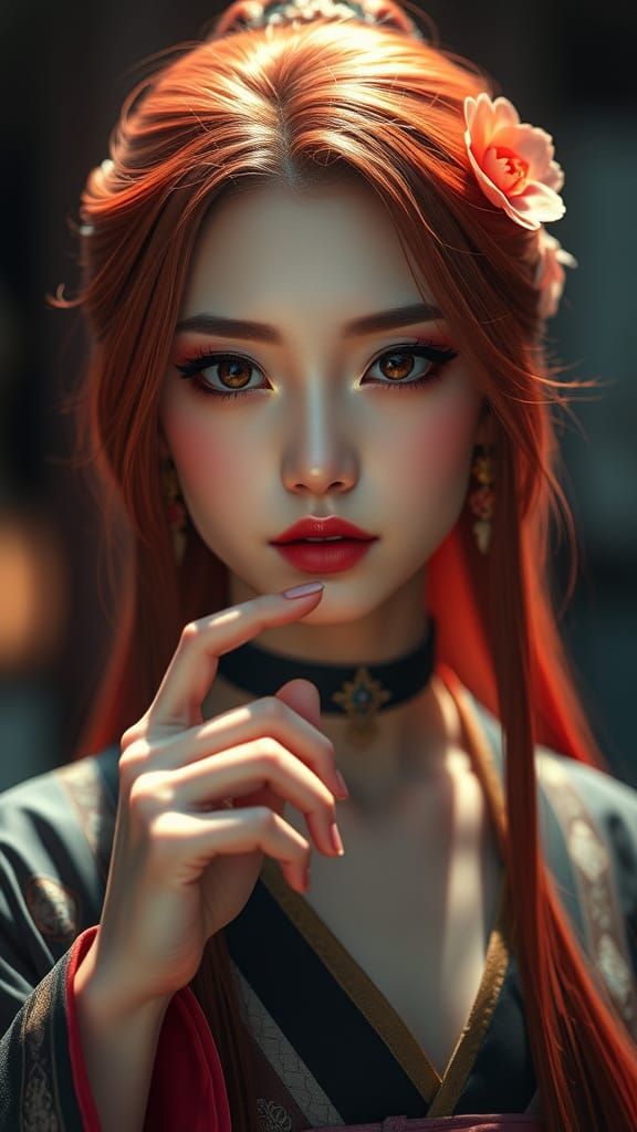 This stunning portrait showcases a young woman with vibrant red hair and captivating facial features, rendered in exquisite hyperrealistic detail with intricate textures and subtle lighting effects.