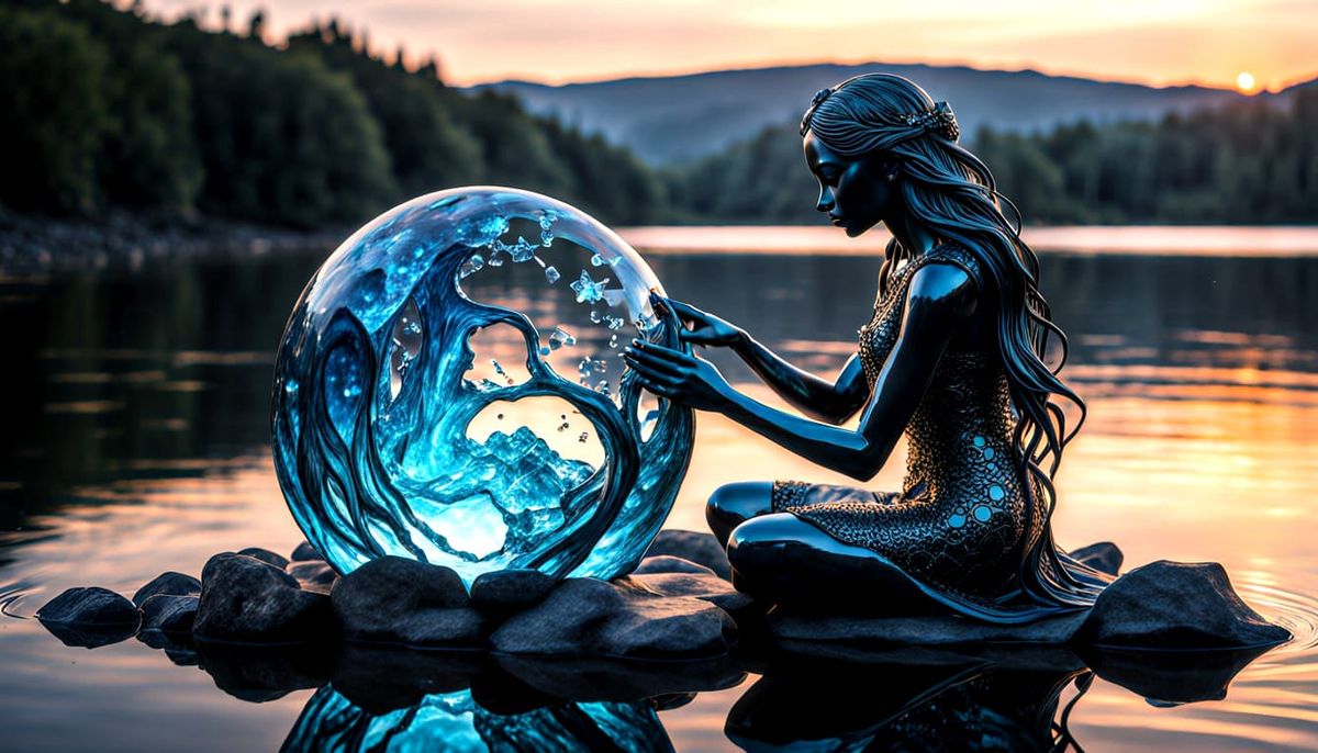 This image depicts a surreal, fragmented sculpture of a woman with flowing hair, kneeling amidst scattered stone pieces by a vibrant sunset. It blends bio art with folklore elements and intricate designs.