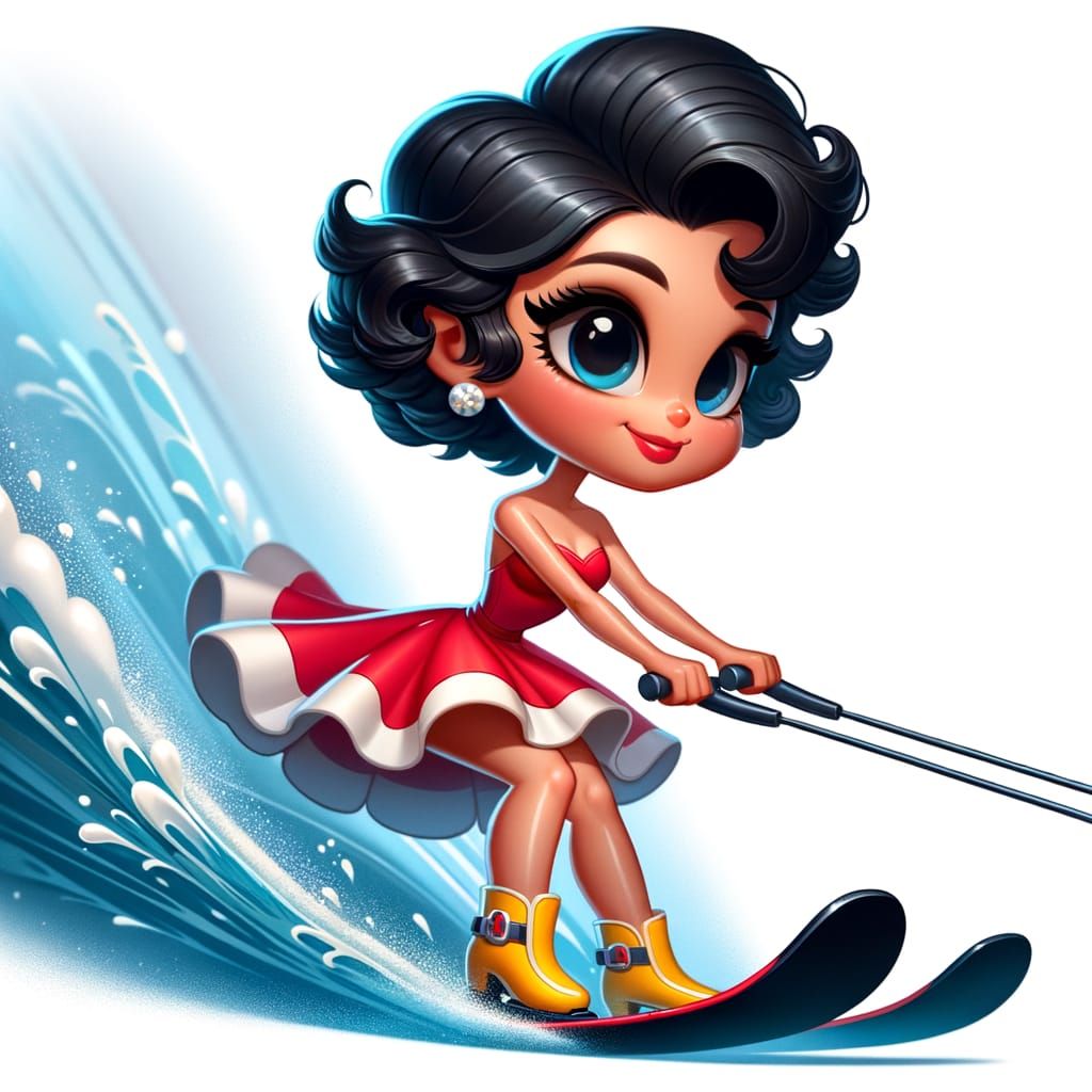 A cartoon-style woman water skis with skill and agility, wearing a red dress and high heels, as her small dog watches from the shore