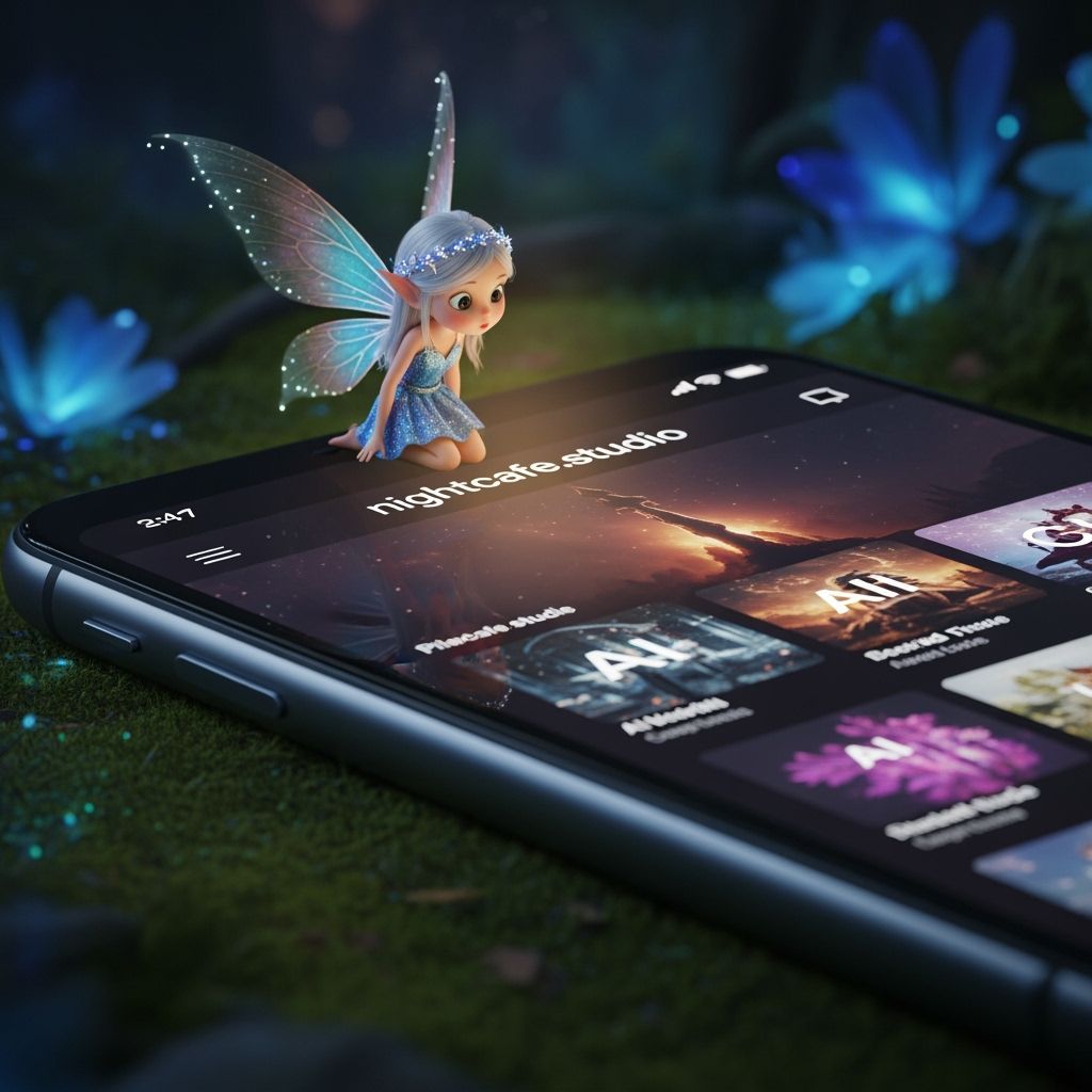 This image shows a miniature fairy sitting on an oversized smartphone, intently observing the Nightcafe website displayed on the screen. The scene is set in an enchanted forest with bioluminescent flora.