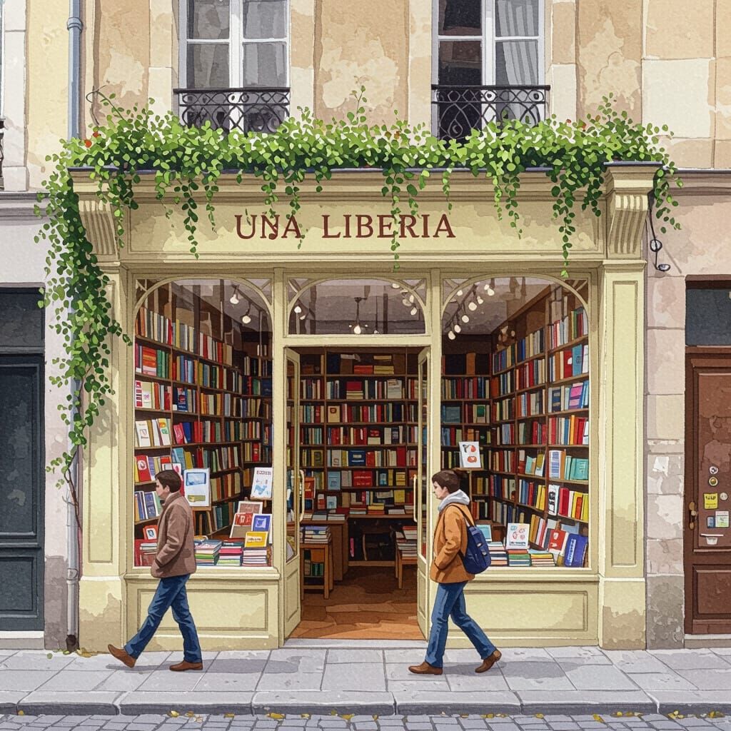 A watercolor painting of an evocative bookstore viewed from the outside. The scene is tranquil, with climbing vines adorning the storefront window, creating a serene atmosphere.