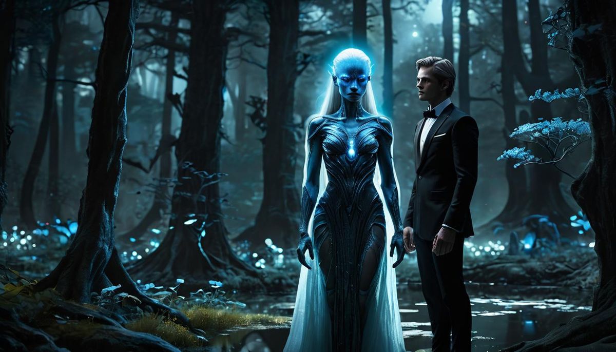 This image shows an alien woman with blue skin and glowing eyes facing a human in a forest. The scene has a romantic, mystical atmosphere, with soft, ethereal lighting and luminous plants.