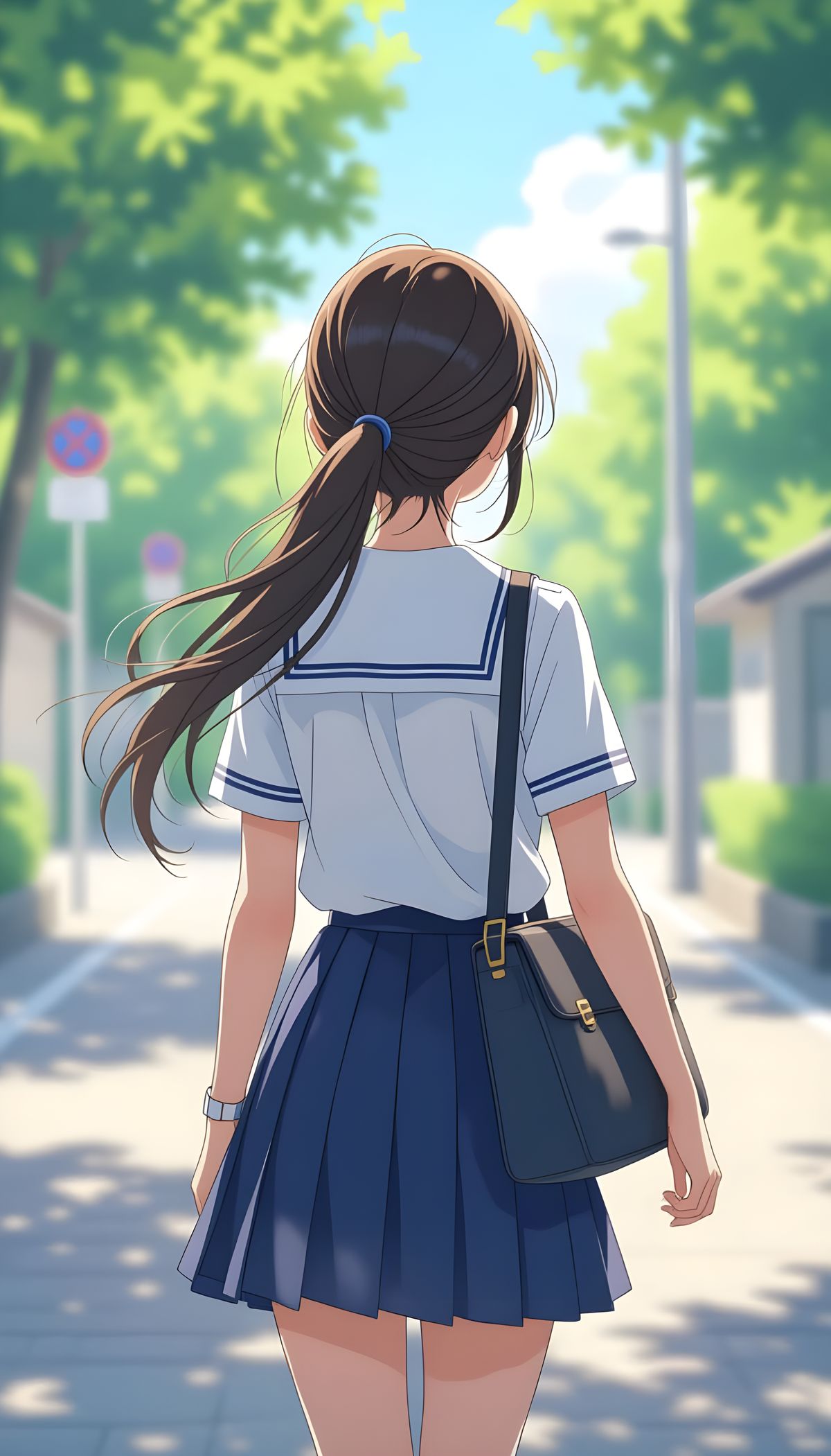 This high-resolution image showcases a detailed anime school girl with a ponytail and shoulder bag, viewed from behind in a peaceful atmosphere.