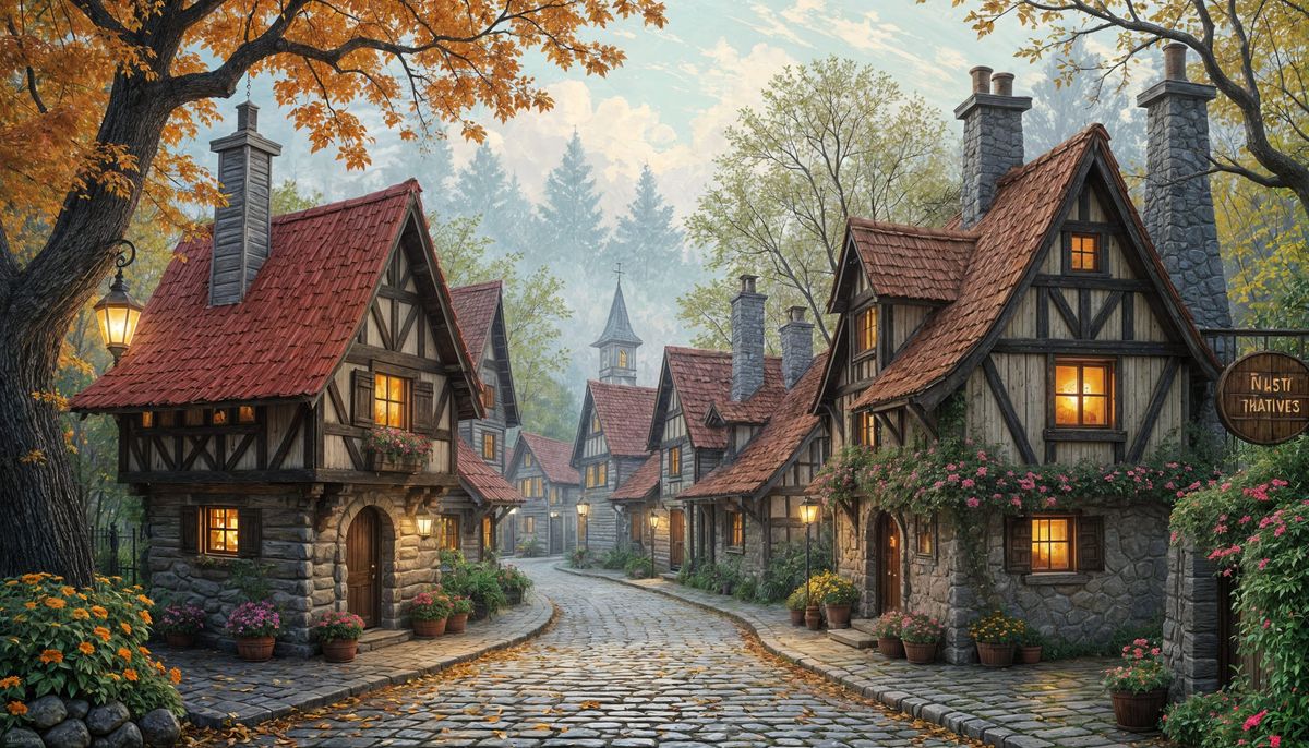 A vibrant impasto painting of a whimsical medieval village in autumn. Enchanted timber-and-stone cottages line a cobbled street, with orange leaves swirling in the breeze, realized as vivid, 3D impasto oil-on-canvas.