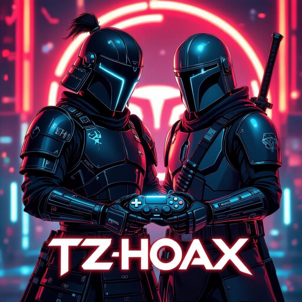 This image shows a futuristic samurai warrior in black armor holding a glowing game controller, with a Mandalorian helmet in the background. The scene is lit with vibrant neon lights in a sci-fi style.