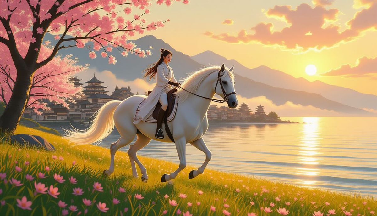 This image shows a white horse galloping through a sakura field near a calm sea at sunset. The scene blends Japanese and Moroccan elements with fantasy and hyperrealism, resembling art from Studio Ghibli.