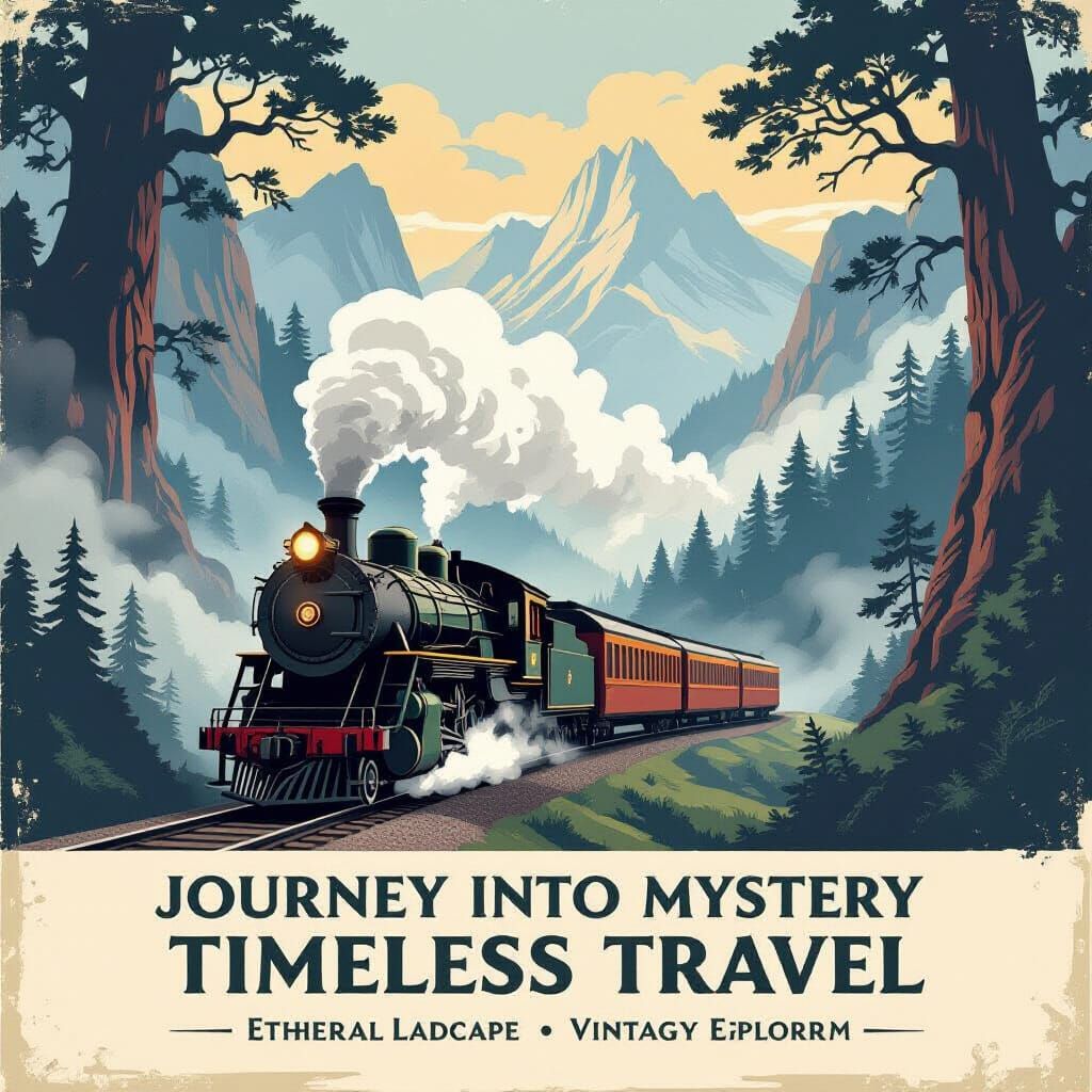 This image depicts a vintage travel poster scene of a steam train journeying through a misty mountain pass, surrounded by ancient trees, evoking wonder and quiet adventure.