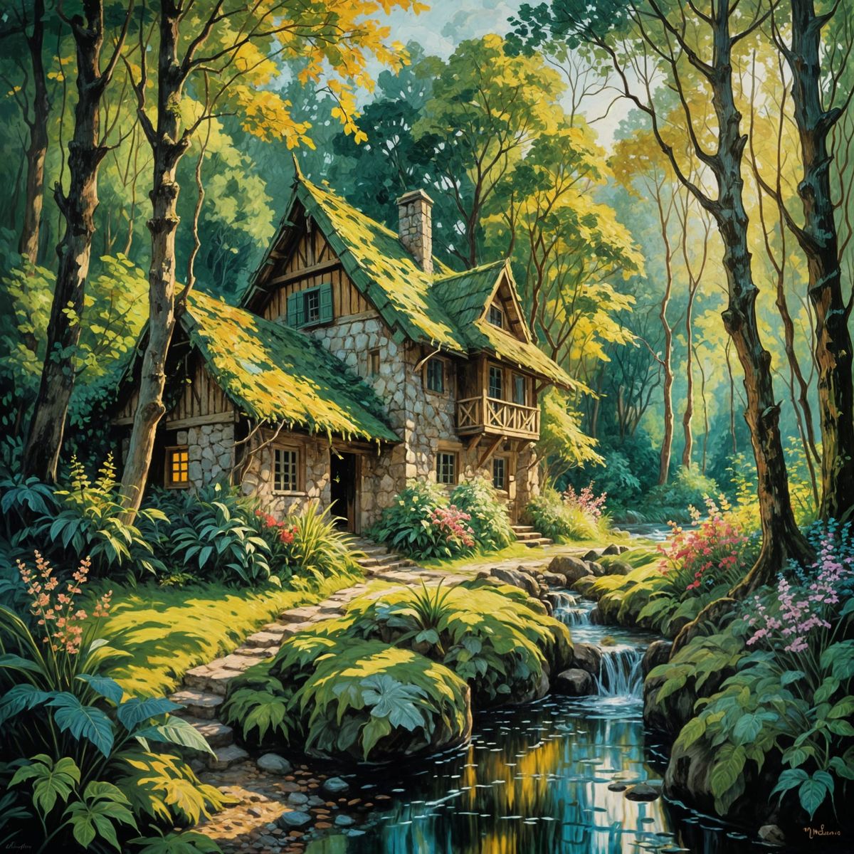 This image shows a charming medieval stone house nestled in a lush tropical forest, surrounded by a waterfall, river, and vibrant flowers, all captured in soft, feathery brushstrokes and warm morning sunlight.