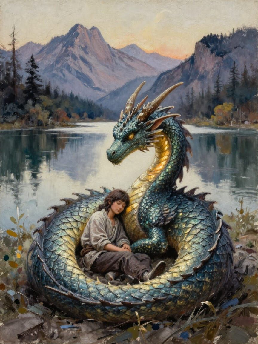 This image shows a gentle dragon curled beside a tranquil mountain lake, its scales glowing in the evening light. Rendered with thick, textured brush strokes in a gouache and watercolor style.