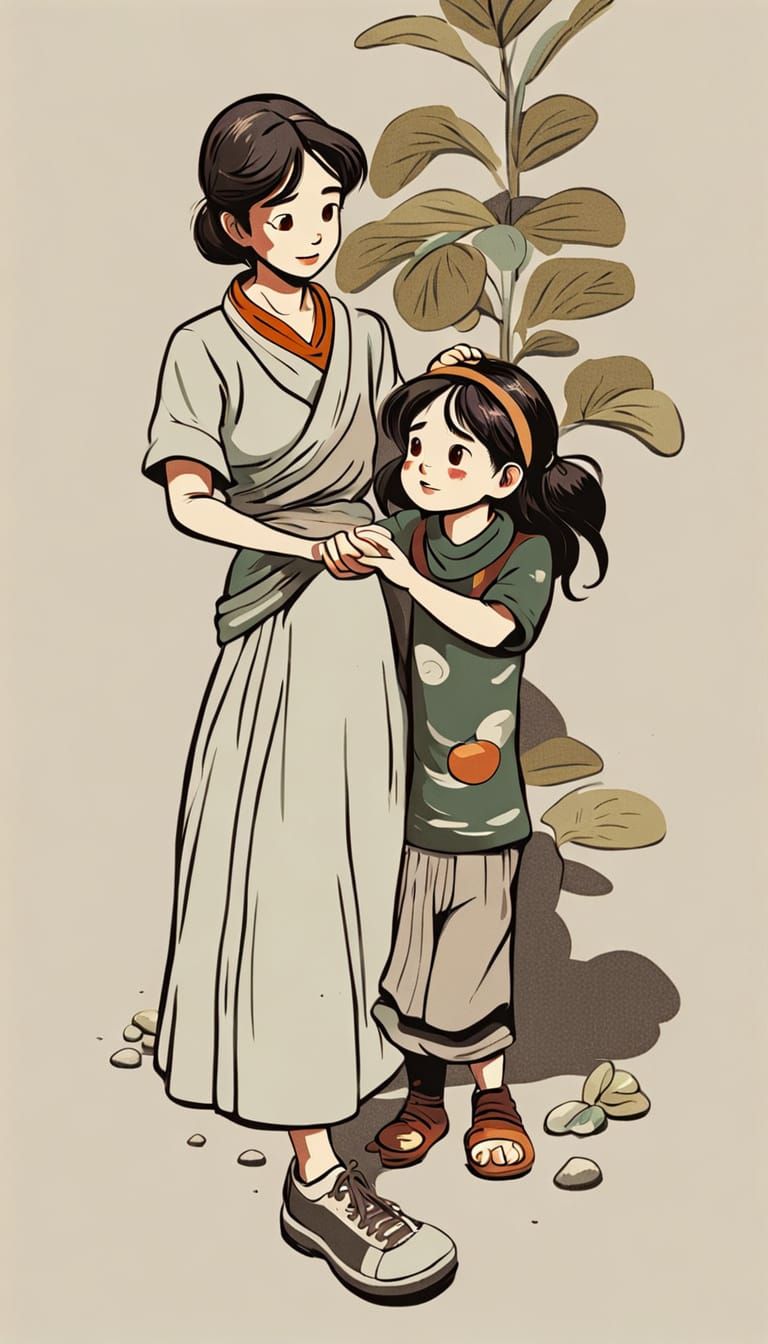 This heartwarming image captures a tender moment of love and family, reminiscent of classic Americana storytelling. Soft, warm light and earthy tones create a cozy atmosphere, evoking feelings of comfort and peace.