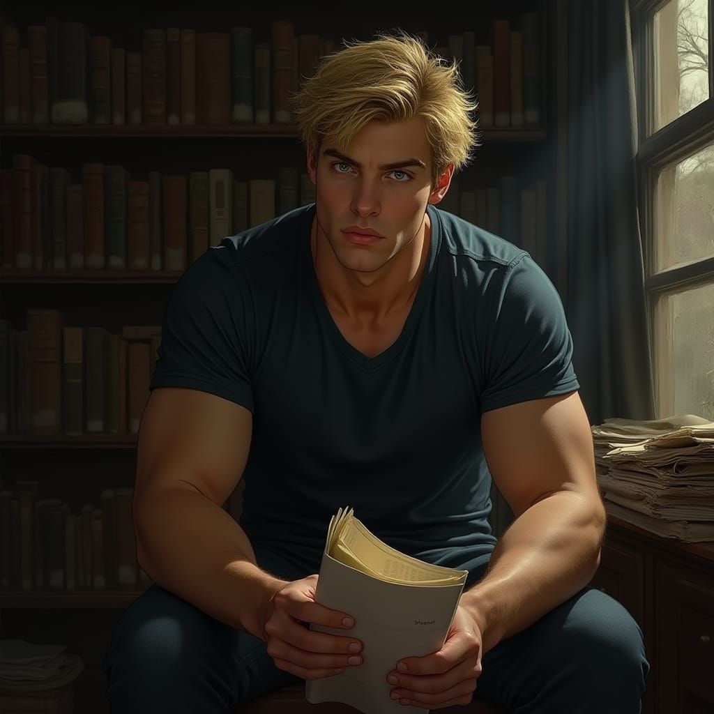 This image shows a muscular young man with blonde hair reading in a dimly lit room. The realistic style captures a somber mood through atmospheric lighting and emotive character details.