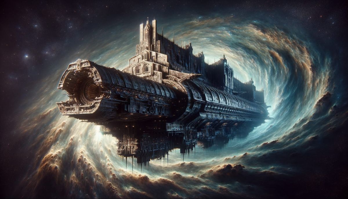 A colossal gothic cathedral spaceship emerges from a nebula. Photorealistic 8k resolution captures its brutalist, biomechanical design with awe-inspiring dread and horrific beauty.