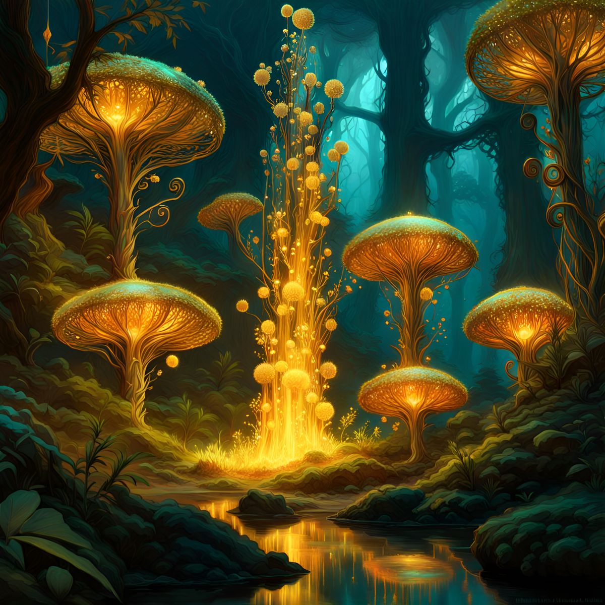 A vibrant image of a magical shrubbery in a Pandora-like forest, serving as a portal. The fantasy art features intricate details, deep colors, and a complementary orange and teal palette.