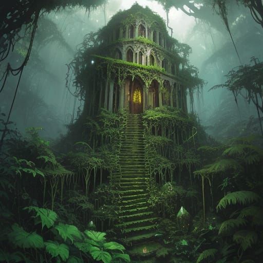 Buried remnants of metal spires and brilliant crystal orbs as well as technology, overgrown by a thick jungle with creeper and liana vines. Mysterious, gouache, oil on canvas, Dan Witz