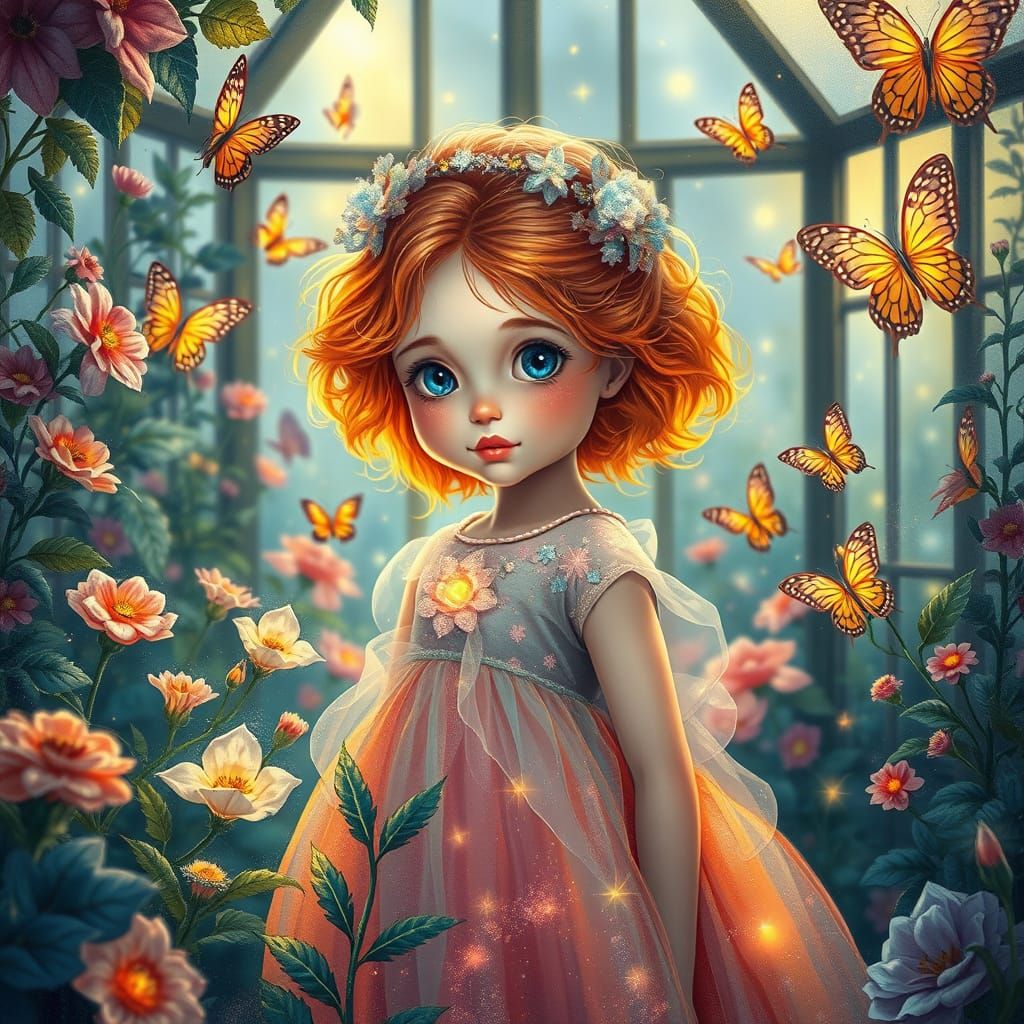 This image shows a girl with sunset-colored hair and gem-like eyes in a greenhouse. The girl is wearing a gown made of starlight, in a glossy, colored pencil style.
