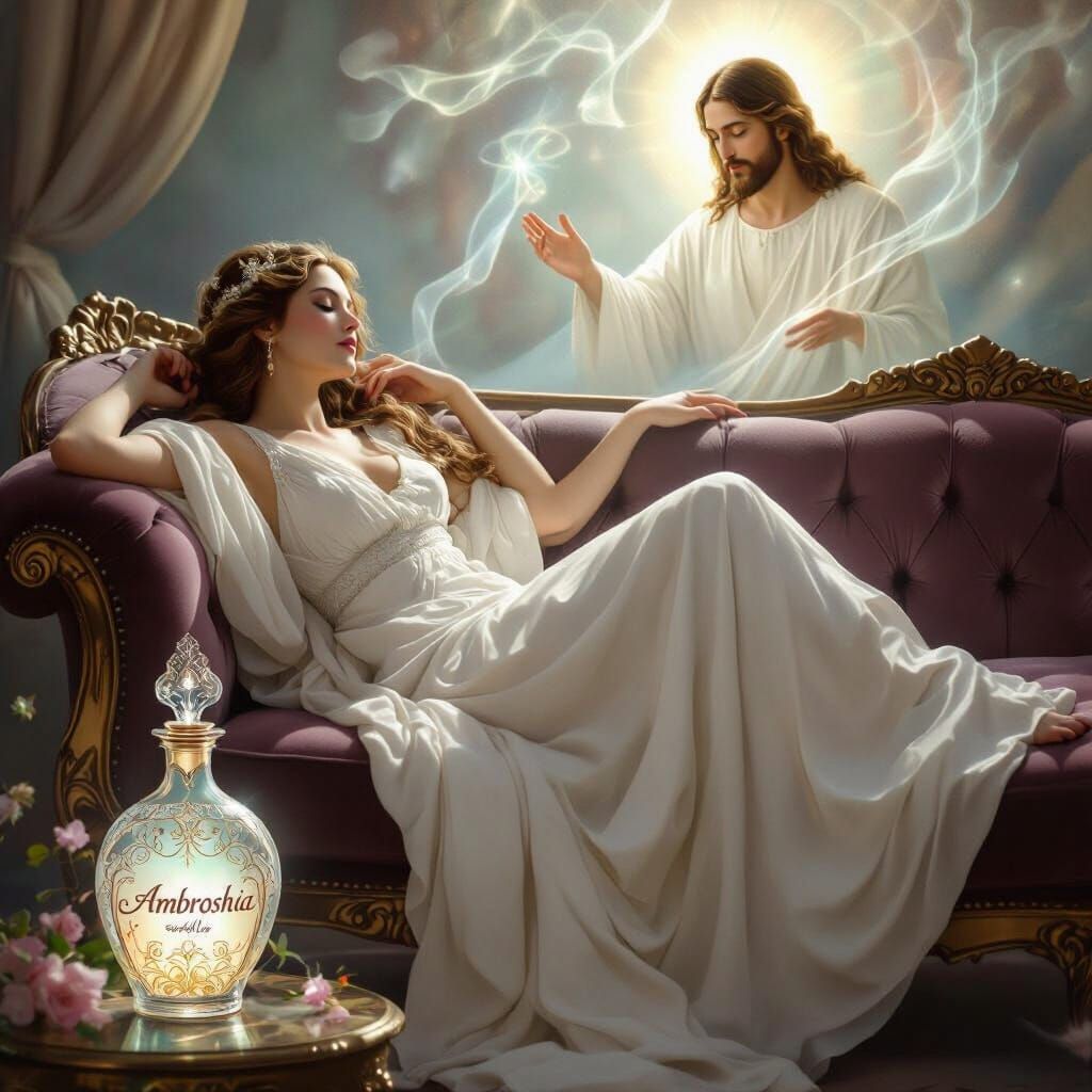 This image shows a woman in a white gown sleeping on a couch, her spirit rising in soft light. A figure hovers nearby holding an ornate bottle. The artwork has a surreal, art nouveau aesthetic.