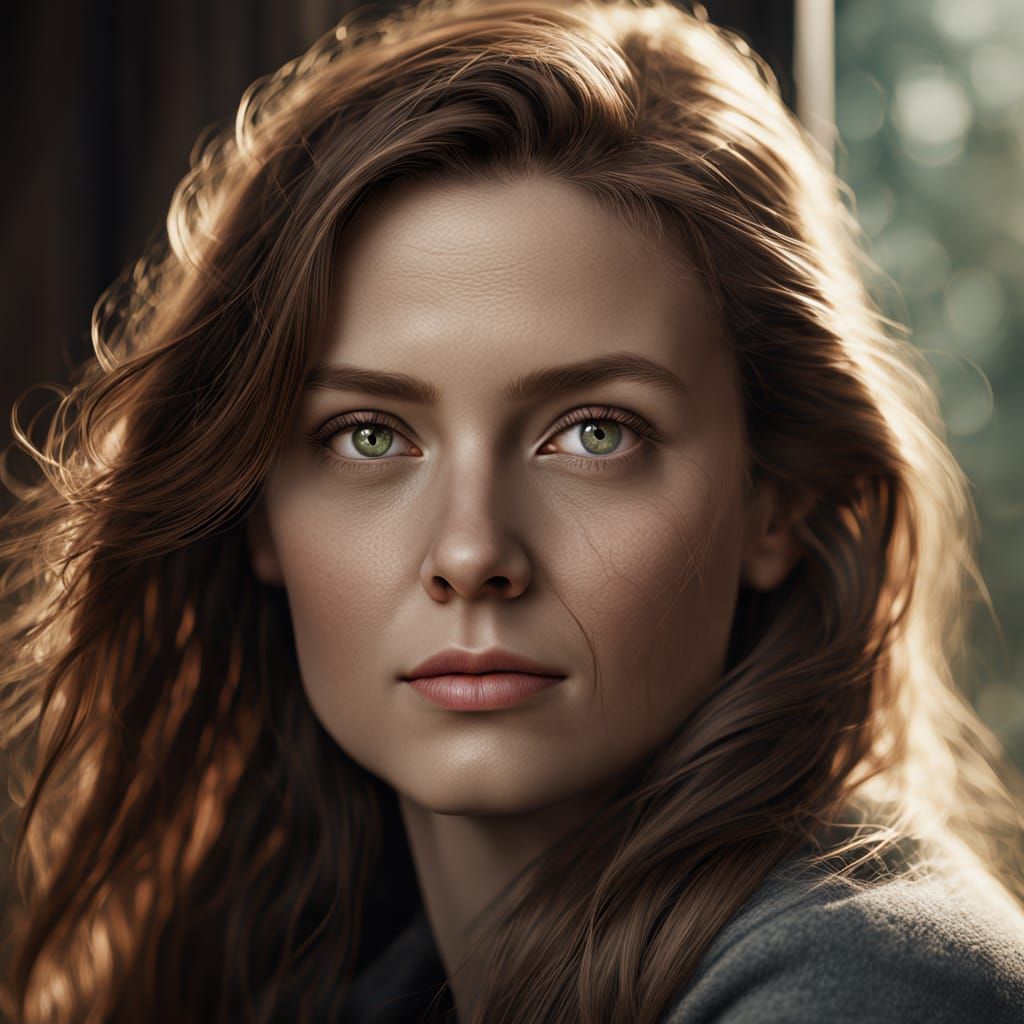 This image shows a photorealistic portrait of a wise woman with profound eyes, set against a serene background. Created in a digital art style with intricate details and realistic depth, the portrait features delicate wrinkles, fine hair texture, and vibrant, lifelike colors.