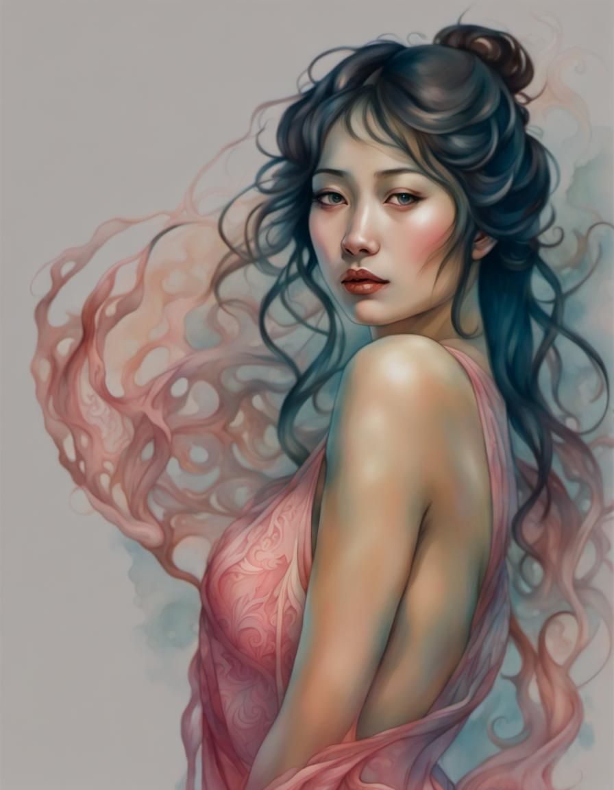 A watercolor painting of a slender Asian woman in a pink chemise. The artwork features transparent washes, loose brushwork, and wet and dry edges, reminiscent of Art Nouveau.