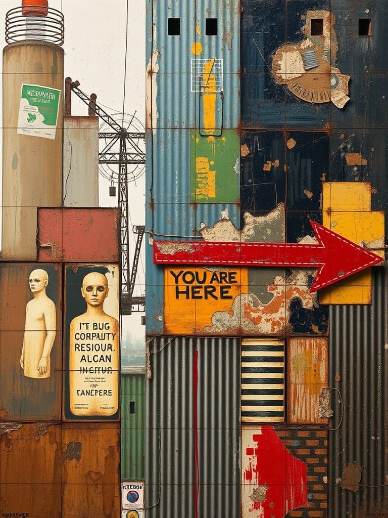 A maximalist abstract painting featuring corrugated steel and twine. The artwork evokes themes of natural decay, incorporating a red arrow and crosshairs. The piece is reminiscent of assemblage art.