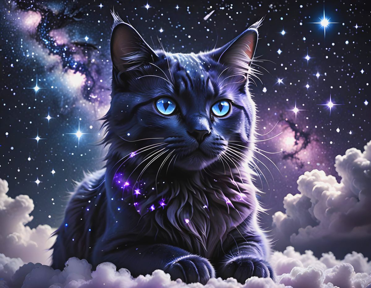 Easily generate magical cat images with our free AI tool, featuring constellation-like fur in various colors