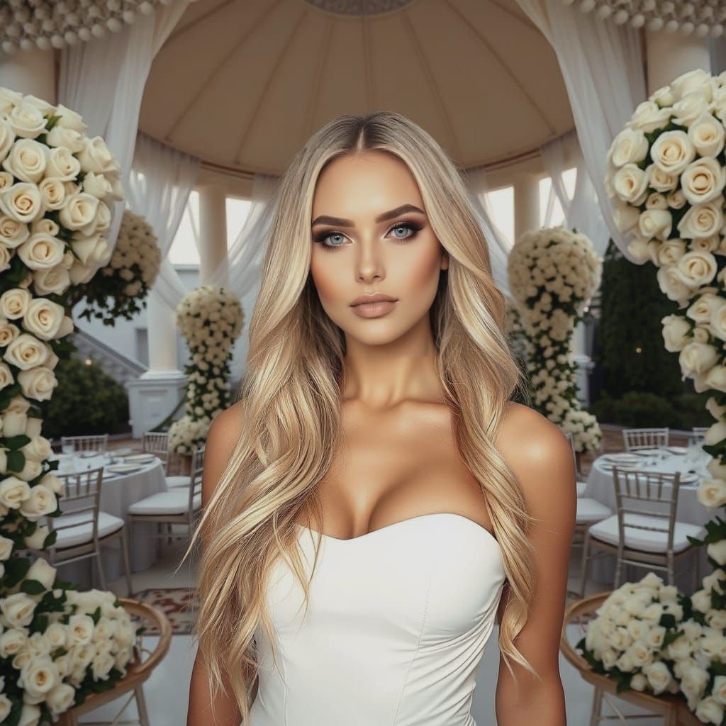 This image shows a stunning bride with long blond hair and blue eyes, wearing a strapless mermaid wedding dress. An elaborate reception with white roses adorns the background.