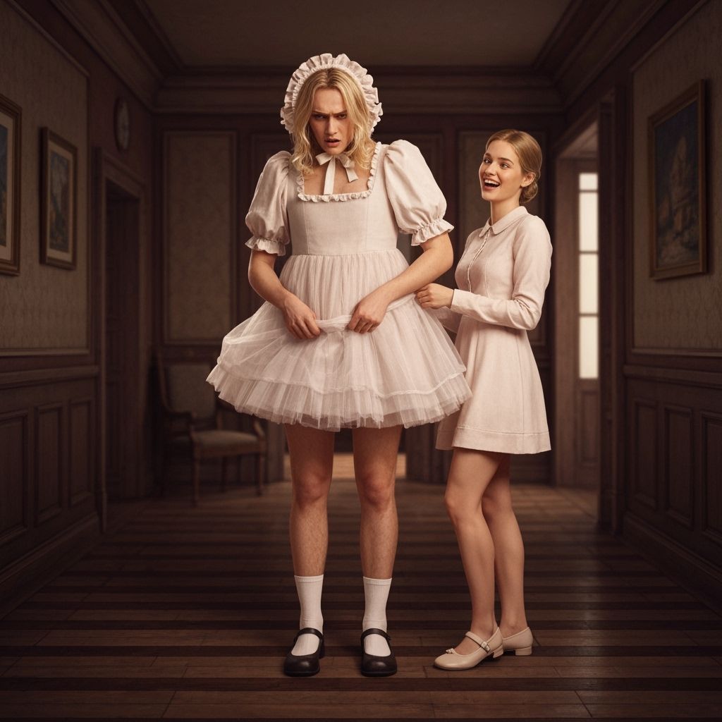 A detailed matte painting depicts a nervous young man in a ruffled bonnet and tulle dress, tugging his skirt. The scene is set in an old-fashioned villa hall, rendered in deep, complementary colors.