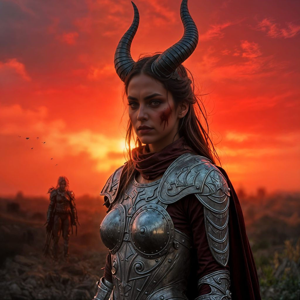 "High fantasy epic attractive female demonic mercenary, deep red skin, silver armor, scenic battlefield, blood red sunset sky, high detail, high quality, correct anatomy, Cinematic film still, shot on v-raptor XL, film grain, vignette, color graded, post-processed, cinematic lighting, 35mm film, live-action, best quality, atmospheric, a masterpiece, epic, stunning, dramatic"