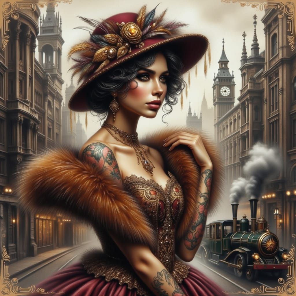 This image depicts a woman with short, curly hair and a striking Scorpio tattoo, posing in a contemplative manner against a richly detailed, misty Victorian London backdrop, blending watercolor and acrylic textures with regal, royal flourishes.