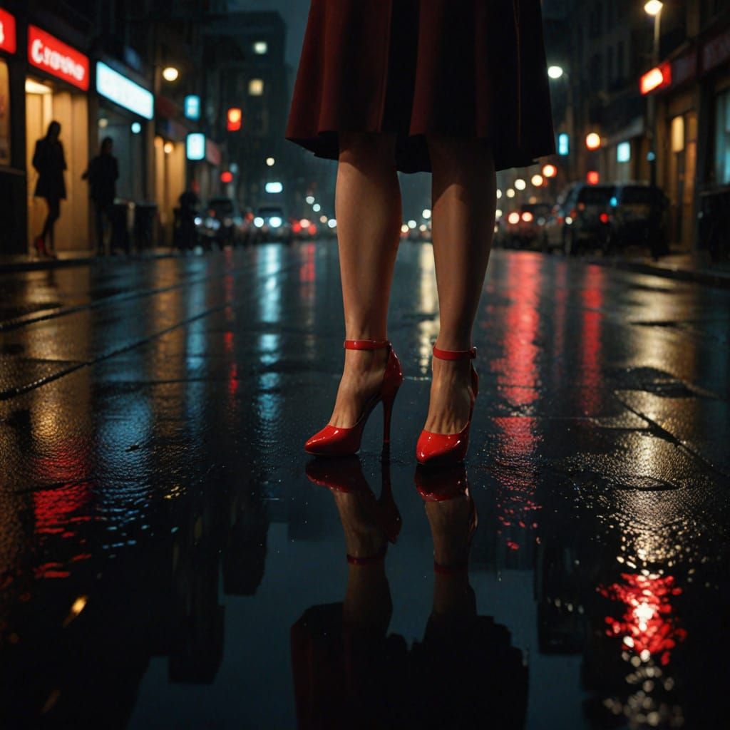 This cinematic image shows a woman walking on a wet city street at night, her red heels a stark contrast to the dark surroundings. Reflections on the slick pavement enhance the moody atmosphere.