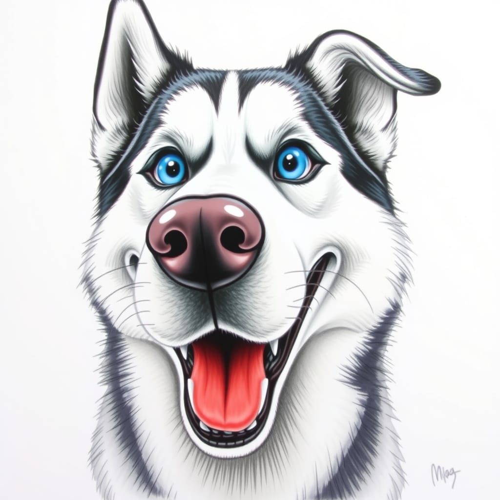 Draw your own funny dog caricatures! Make happy Siberian Huskies with big heads and blue eyes easily.