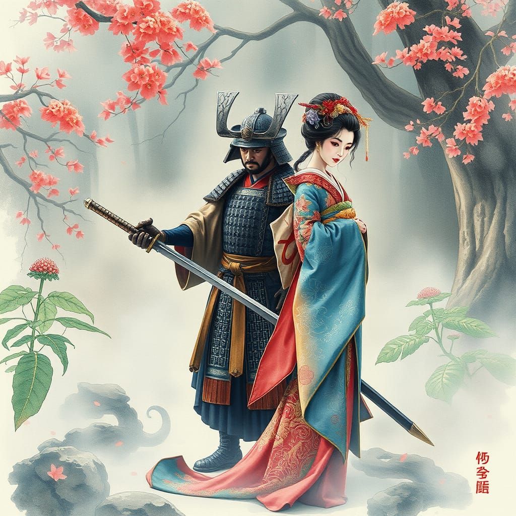 A dramatic image of a samurai warrior with a katana and a geisha using elemental powers. The artwork evokes traditional Japanese art with watercolor textures and a mystical ambiance.