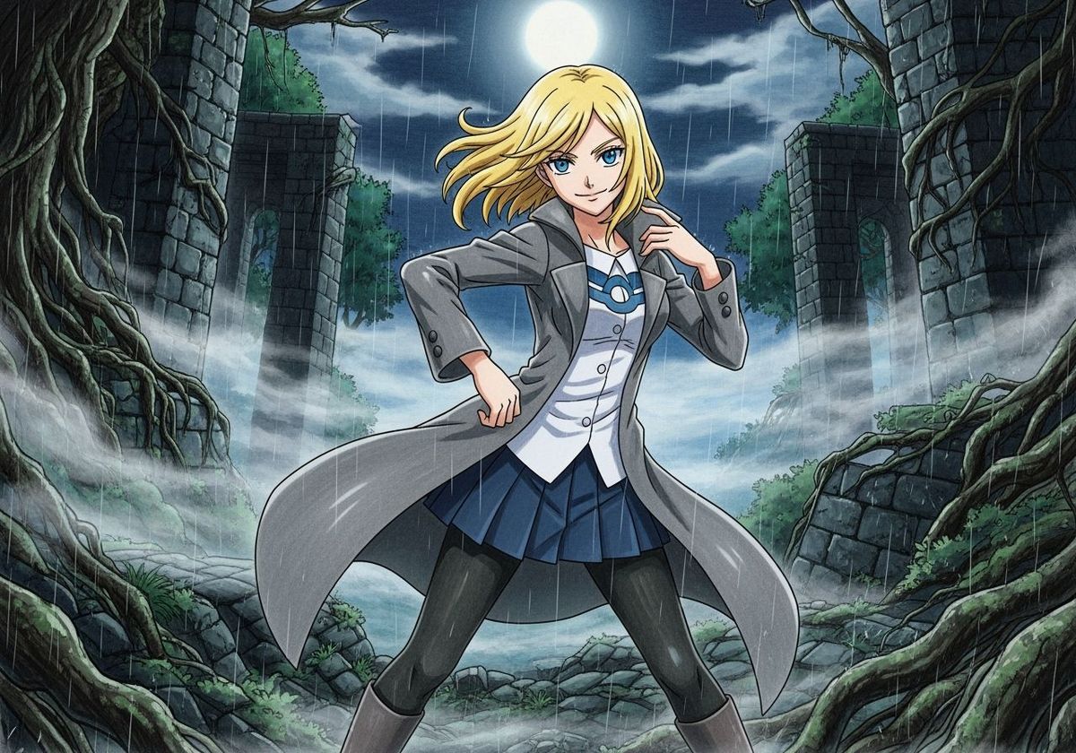A full-body shot of a blonde Pokémon trainer in a windswept, overgrown ruin at midnight. The anime-style art, reminiscent of iconic manga artists, employs a dark, melancholic palette.