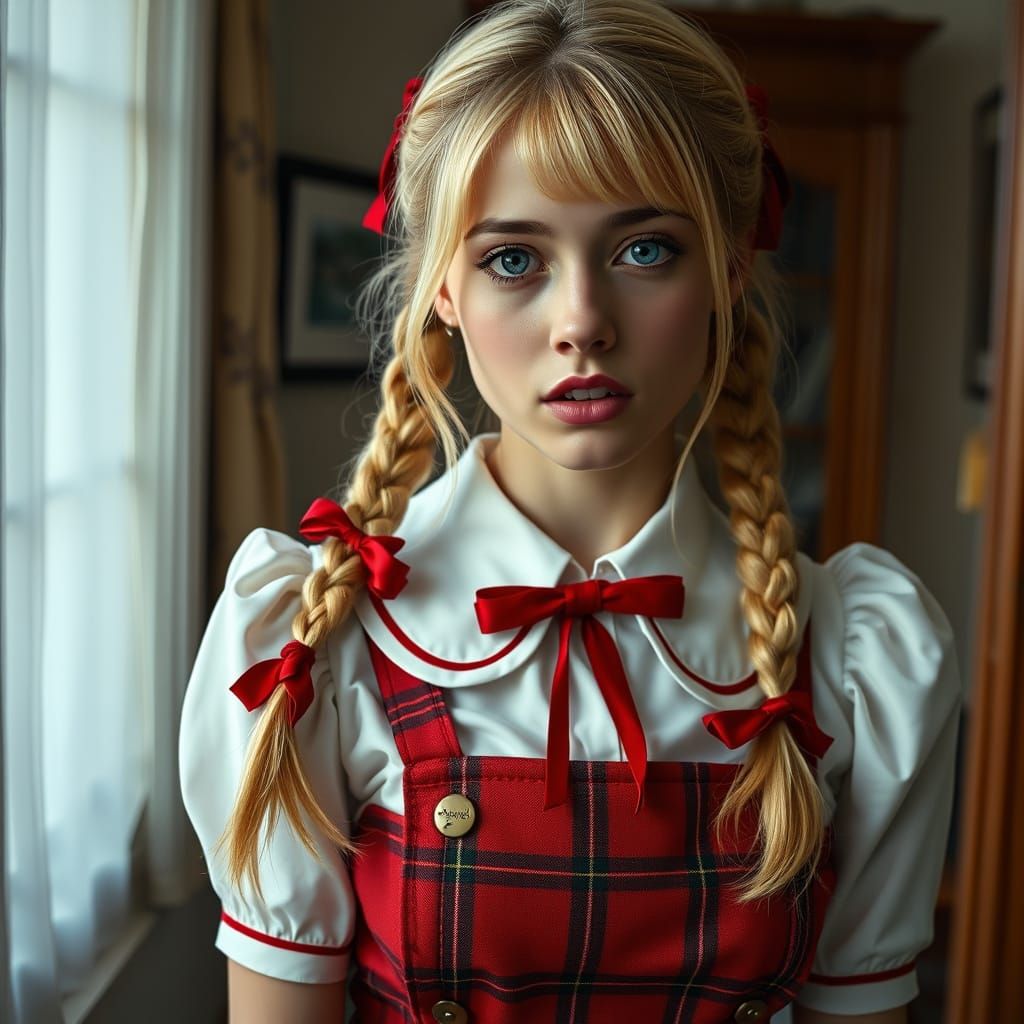 This image shows a 19-year-old woman named Lena with long blonde hair styled in braided pigtails, adorned with a red bow. She wears a school uniform and gazes with concern in this digital painting.