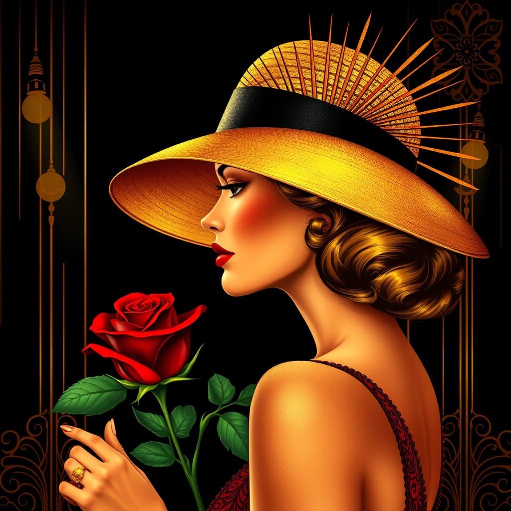 This image captures a glamorous Old Hollywood woman in profile, holding a glowing red rose. The illustration features Art Deco patterns, jazzy nightclub elements, and dramatic lighting in a noir style.